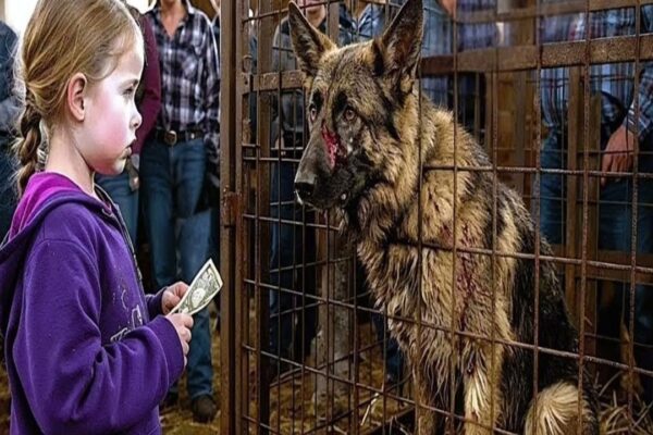 El granero estaba lleno de ruido, ladridos y risas estridentes, pero en un rincón solitario, un pastor alemán lleno de cicatrices temblaba detrás de unos barrotes oxidados. Su pelaje estaba...