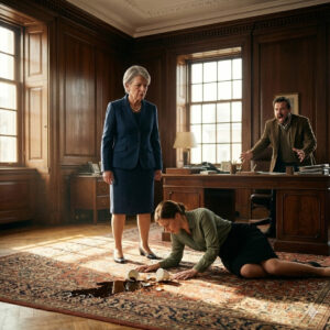 Cinco minutos después, el silencio de la oficina fue roto por un golpe seco y sordo. El cuerpo de Nuria se desplomó sobre la alfombra persa; la porcelana se hizo añicos.