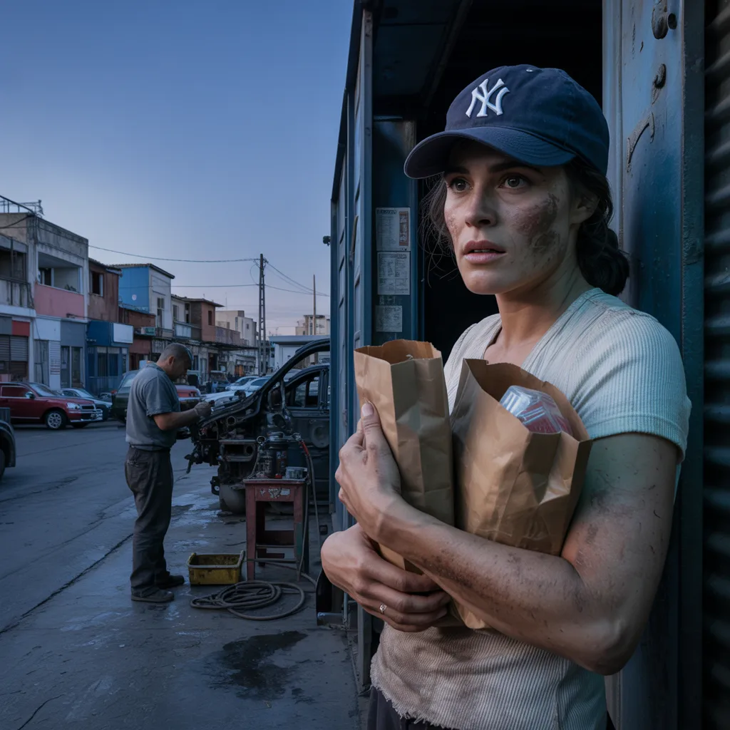 Ella estaba parada en el umbral de concreto, completamente fuera de lugar frente al fondo de paredes de ladrillo industrial cubiertas de polvo y una fila de viejos camiones estacionados al otro lado de la calle.