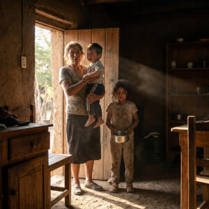 Luz María no esperó a escuchar el final de la anécdota. Corrió. Sus pulmones ardían y el aire frío del pueblo le golpeaba el rostro, pero solo podía pensar en la fragilidad de Pacho. Al cruzar el umbral de la casa vecina, la imagen la dejó gélida: el pequeño Pacho estaba sentado en el suelo sucio, llorando con un gemido rítmico de puro agotamiento. Valentina, con las manos manchadas de polvo, buscaba desesperadamente una bolsa de pasta en una alacena vacía, mientras intentaba consolar a sus hermanos: “No lloren, mis niños, ya casi sale el desayuno”.