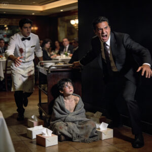 Tragué saliva, sintiendo un nudo áspero en la garganta. No miré al gerente, ni a los clientes que me observaban con lástima o irritación. Mi mirada voló instintivamente hacia el pequeño carrito de servicio de madera oscura que estaba estacionado cerca de la pared, lejos de las luces principales. Detrás del carrito, escondido a duras penas entre pesadas cajas de servilletas y montones de manteles limpios, había un niño pequeño envuelto en una cobija gris gastada.
