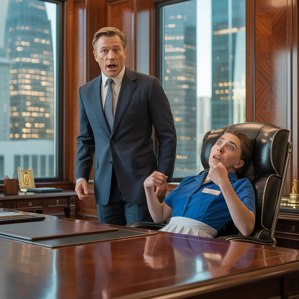 Otávio se detuvo en el umbral. Sus ojos, acostumbrados a detectar el más mínimo error en un balance financiero, tardaron un segundo en procesar la imagen frente a él. En su silla de cuero italiano —su “trono”, como bromeaban sus socios—, una figura encorvada dormía profundamente. Era Renata. El uniforme azul de “Alvorada Serviços” desentonaba con la elegancia caoba del mobiliario. Tenía la cabeza ladeada y un trapo de microfibra todavía sujeto en su mano derecha, como si el sueño la hubiera asaltado a traición en medio de un movimiento.