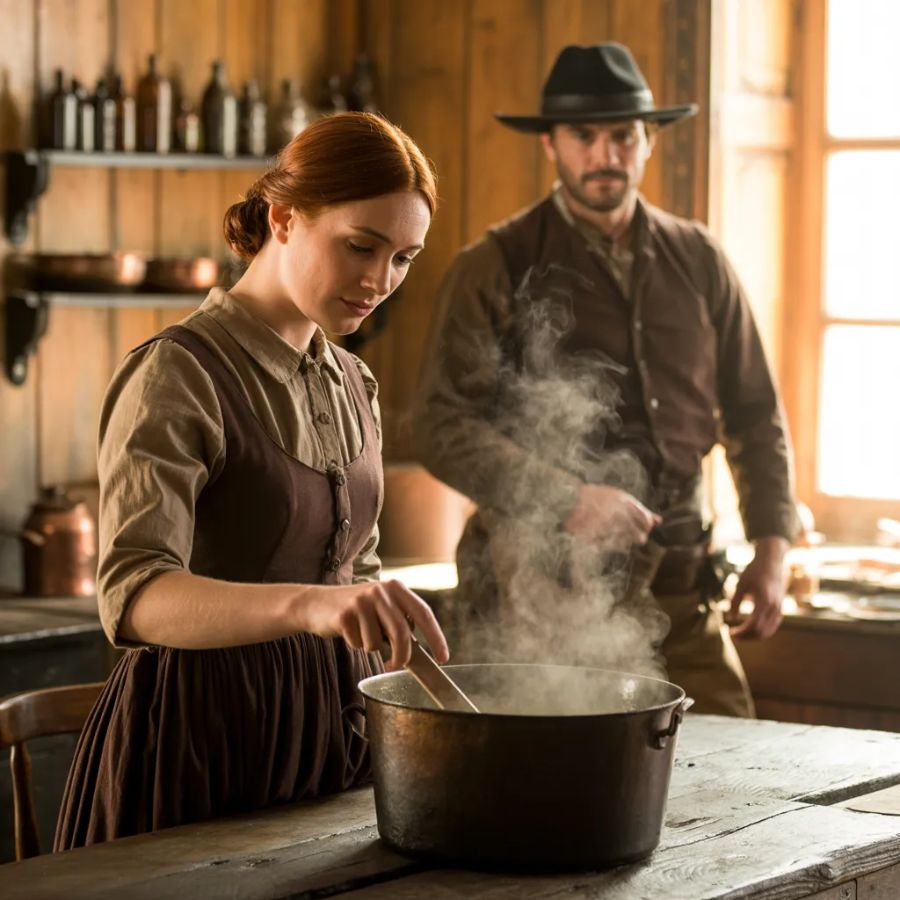 En menos de media hora, la cocina dejó de parecer una tumba. Miguel Ortega, un peón de manos cuidadosas y pocas palabras, avivó el fogón hasta hacerlo rugir. Tomás acarreó cubetas de agua sin parar. Don Chalo bajó del altillo dos frascos de duraznos secos cubiertos de polvo. Otro hombre trajo verduras. Clara trabajó como si la vida se le fuera en ello, porque en cierto modo así era.