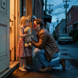 La palabra fue suave, casi tragada por la lluvia, y cuando me giré vi a una niña pequeña en la puerta de una casa estrecha y desgastada, con pintura descascarada y escalones vencidos. Tendría siete u ocho años, descalza pese al pavimento frío, sosteniendo un conejo de peluche viejo cuya oreja colgaba de un hilo. Tenía el cabello enredado sobre los hombros y los ojos más firmes de lo que deberían ser a esa hora.
