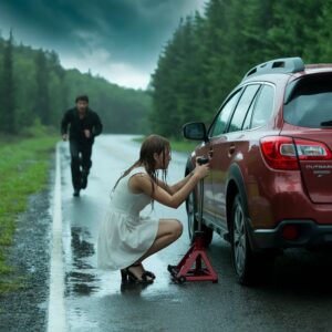 Al girar hacia una vía secundaria, vio a una mujer de pie junto a un sedán gris con el maletero abierto y una llanta de repuesto en el suelo.