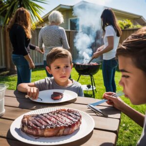 En nuestra barbacoa familiar, el hijo de mi hermana recibió un jugoso filete T-bone, pero a mi hijo le dieron un trozo de grasa quemada tan duro que apenas parecía comestible. Mi madre se rió. “Eso debería ser suficiente para él, ¿verdad?” Mi hermana se burló, “Incluso la comida para perros parece más apetitosa.”