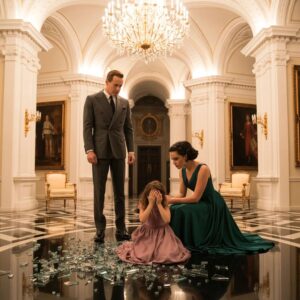 Caminó hacia la sala principal, sus zapatos resonando contra el mármol pulido. Al doblar la esquina, la escena lo golpeó directo en el pecho, robándole el aliento. Su pequeña Valentina estaba arrodillada en el suelo, rodeada de cristales afilados, con el rostro empapado en lágrimas y la respiración agitada. A su lado, Mónica la observaba desde arriba, con los brazos cruzados y una mueca de fastidio absoluto.