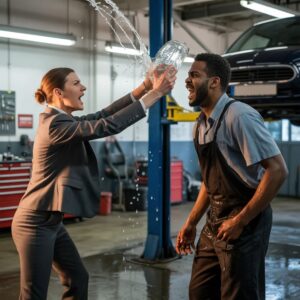 Un segundo estaba de pie junto al prototipo V12 averiado en la bahía central de Halstead Performance, con grasa en las manos y una tableta de diagnóstico en el bolsillo. Al siguiente, el agua fría corría por mis mejillas, goteaba desde mi barbilla y empapaba la parte delantera de mi camisa de trabajo mientras media tienda me miraba como si acabaran de presenciar una pelea en plena iglesia.