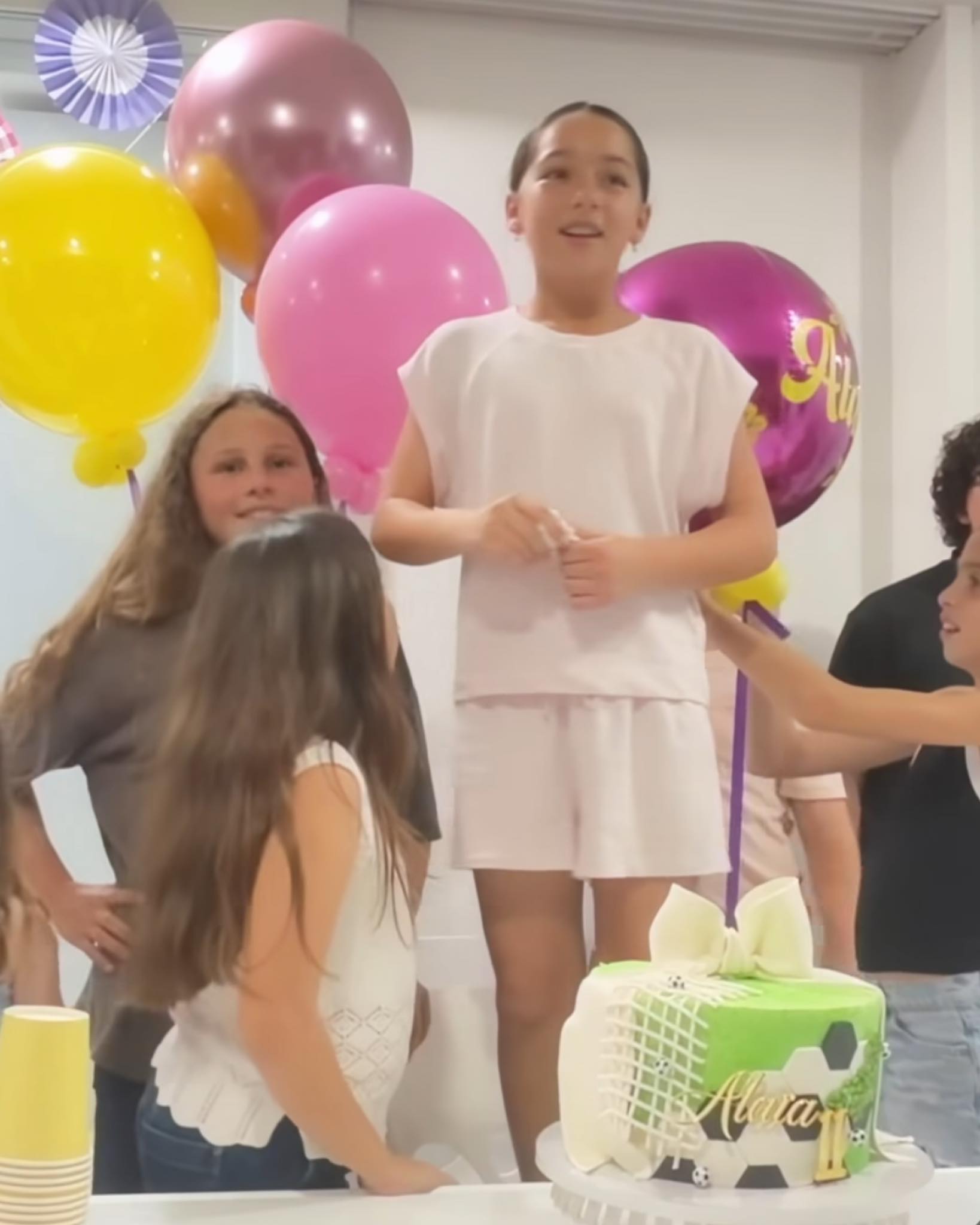 En las imágenes se ve a la niña frente a su pastel mientras comparte con varios amigos y familiares, en un ambiente lleno de globos y decoración festiva.