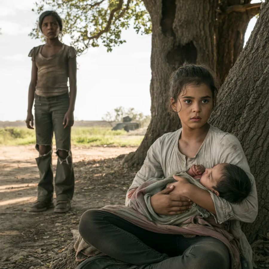 Una pequeña figura salió de entre la línea de árboles, avanzando despacio, tambaleándose. Cabello rubio enredado con hojas y ramitas. Un bulto más pequeño apretado contra su pecho.
