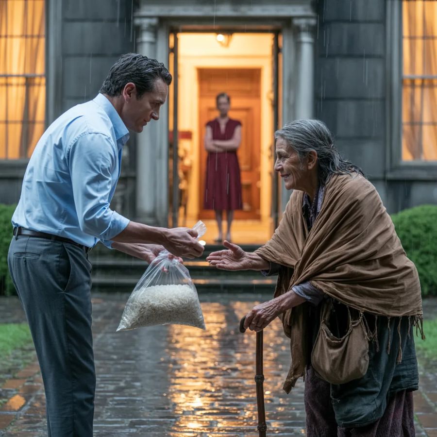 A sus 70 años, Doña Rosa fue prácticamente echada de la casa de su propio hijo con una bolsa de arroz en los brazos, mientras la lluvia le corría por la cara como si hasta el cielo quisiera esconderle la humillación.