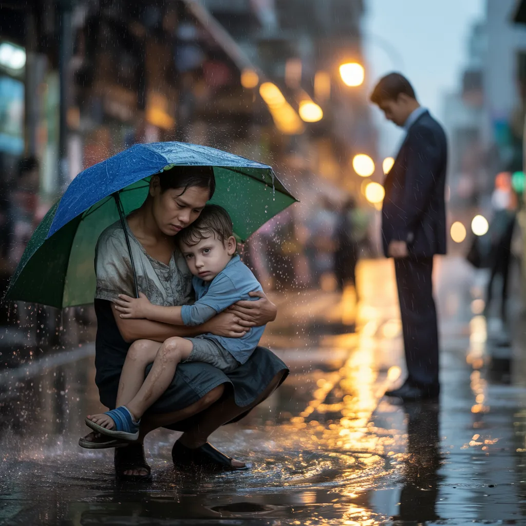 Fue entonces cuando lo vio. A unos metros, bajo la lluvia, un niño de no más de doce años lloraba desconsoladamente. Su uniforme escolar, impecable pero ahora empapado, delataba que no pertenecía a ese entorno. Sus zapatos eran caros, su mochila de marca, pero su rostro estaba lleno de miedo. Esperanza no dudó. A pesar de su propia situación, se acercó con suavidad, inclinándose un poco para no despertar a su bebé.