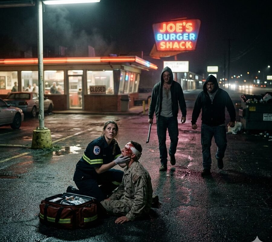 “She Just Wanted Food After a 12-Hour Shift… But When She Saved a Bleeding Marine in a Dark Parking Lot, She Unknowingly Triggered a Military Response That Came Straight to Her Door”