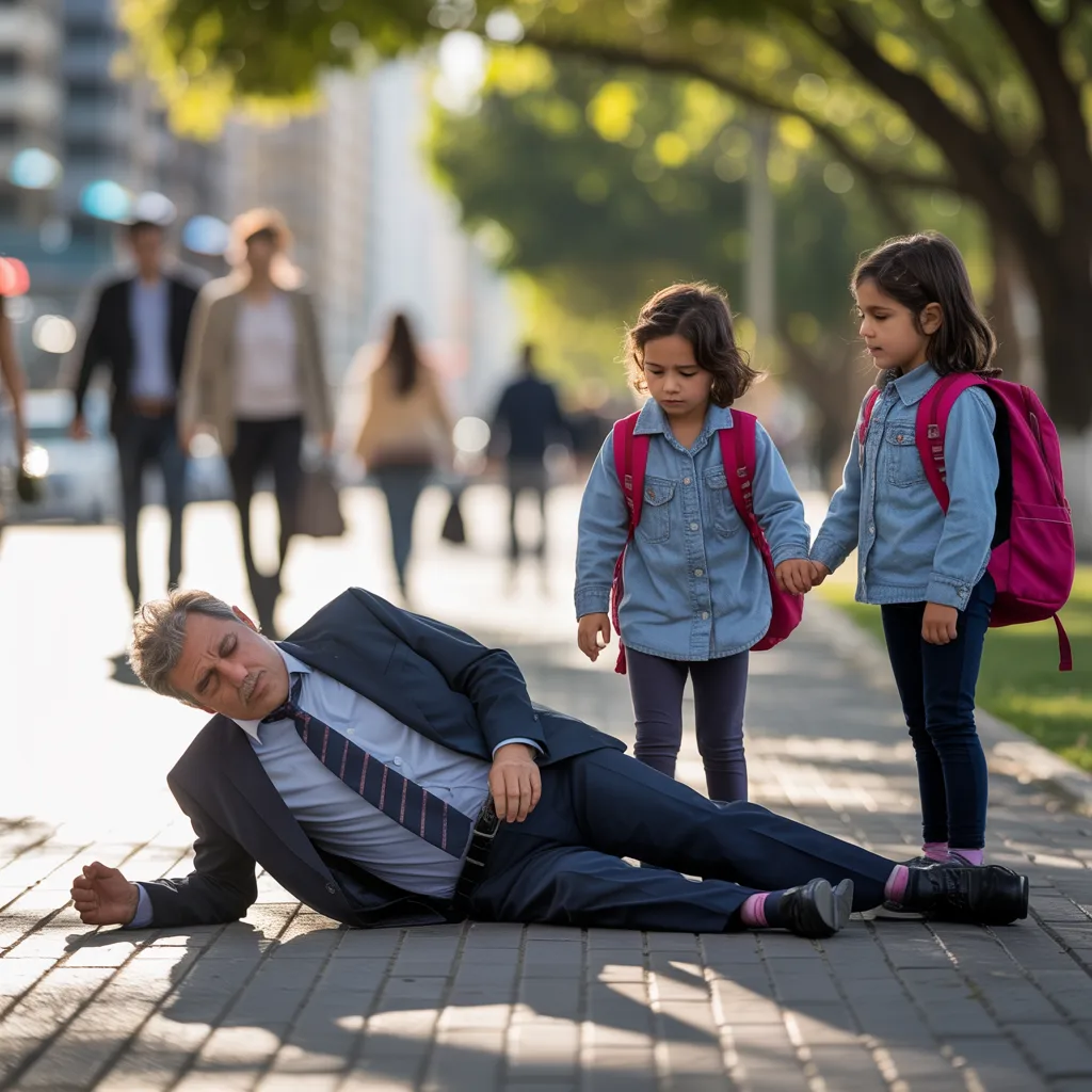 Durante los minutos que parecieron horas, su vida se desvanecía lentamente en medio de miradas ausentes. Hasta que aparecieron ellas. Dos niñas de cinco años, Lucía y Mariana, pequeñas figuras que caminaban de la mano con mochilas demasiado grandes para sus espaldas. Vestían ropa sencilla, ajustada a su tamaño, pero en sus ojos brillaba una atención que nadie más parecía tener. No dudaron ni un segundo. Se detuvieron frente a él, como si supieran que aquel hombre necesitaba su ayuda, que su presencia era imprescindible en un instante donde los adultos fallaban. Mariana sacó un teléfono viejo, con la pantalla rota, y habló con firmeza, describiendo lo que ocurría. Lucía tomó la mano del hombre, fría y pesada, y susurró palabras de ánimo que nadie escuchaba, pero que parecían contener la fuerza suficiente para sostener la vida de un ser que había olvidado lo que significaba depender de otros. El viento jugaba con sus cabellos y con las mochilas, y por un instante, el tiempo se detuvo. Cuando las sirenas finalmente rompieron el silencio y los paramédicos llegaron corriendo, las niñas permanecieron junto al hombre, observando cada movimiento de las manos que intentaban devolverle la vida, sin alardes, sin reconocimiento. Habían comprendido algo que los adultos ignoraban: que la acción, la decisión rápida y la atención pura podían cambiar un destino.