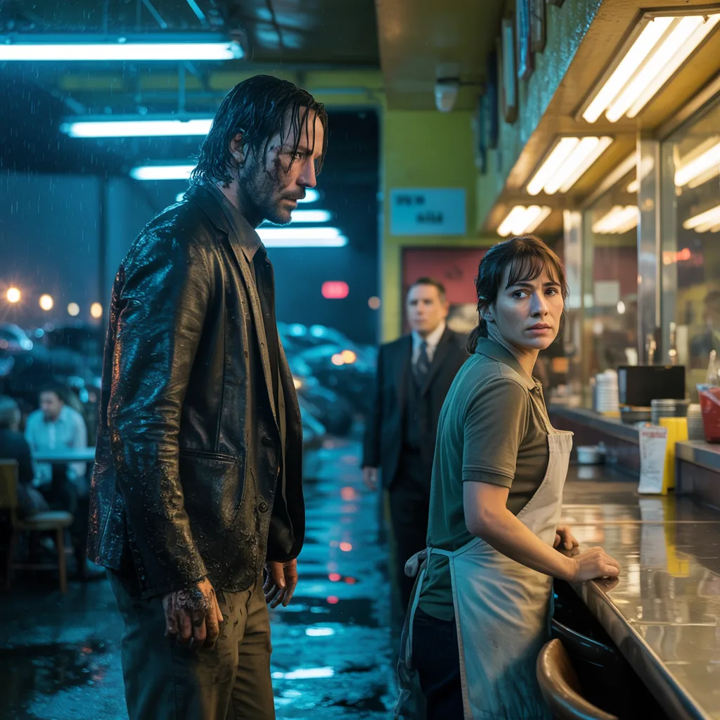 Keanu extendió la mano hacia Alana, no como invitación, sino como reconocimiento: no eran un desconocido y una camarera más. Eran dos personas empujadas por fuerzas más grandes que ellos mismos, conectadas por decisión, valentía y la simple necesidad de hacer lo correcto. Y mientras la lluvia continuaba cayendo, pero ya menos furiosa, ambos sabían que esa noche no terminaría como cualquier otra. Sabían que estaban a punto de enfrentarse a una red de secretos que implicaba mentiras, poder y vidas humanas, y que necesitarían no solo coraje, sino confianza para avanzar.