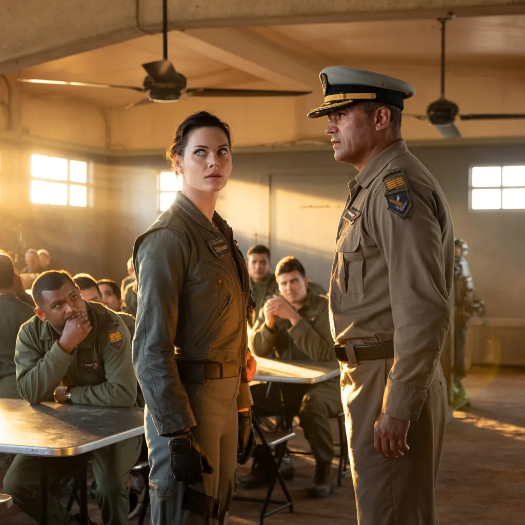 El comedor militar de la Base Aérea en el desierto de Sonora estaba impregnado de calor y ruido, una mezcla de voces, risas contenidas y el constante choque de utensilios contra bandejas metálicas. Afuera, el sol caía con una fuerza despiadada sobre la arena infinita, pero dentro, el aire acondicionado apenas lograba contener la sensación sofocante. En ese entorno rígido y ordenado, cada detalle parecía seguir una coreografía invisible dictada por la jerarquía y la disciplina. Sin embargo, aquel día, una sola presencia alteraba el equilibrio cuidadosamente mantenido.