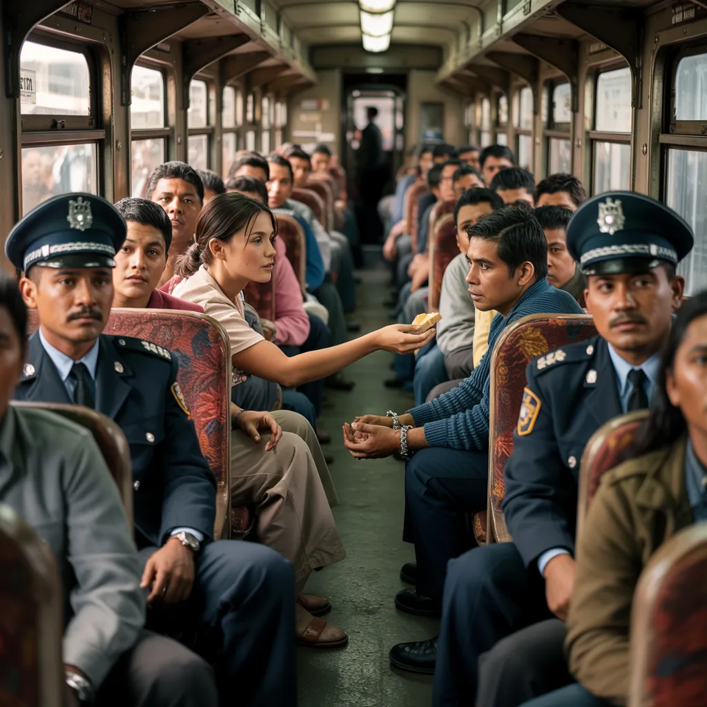 María intentó no mirar, concentrándose en su propio espacio, en su propio cansancio. Pero cuando sacó uno de los panes y dio el primer mordisco, sintió una mirada fija sobre ella. Levantó los ojos y se encontró con los del prisionero. No había agresividad en ellos, ni desafío, sino algo más difícil de describir: hambre. Un hambre que no era solo física, sino que parecía atravesar algo más profundo. Durante unos segundos, el tiempo se suspendió entre ambos, como si el resto del vagón dejara de existir.