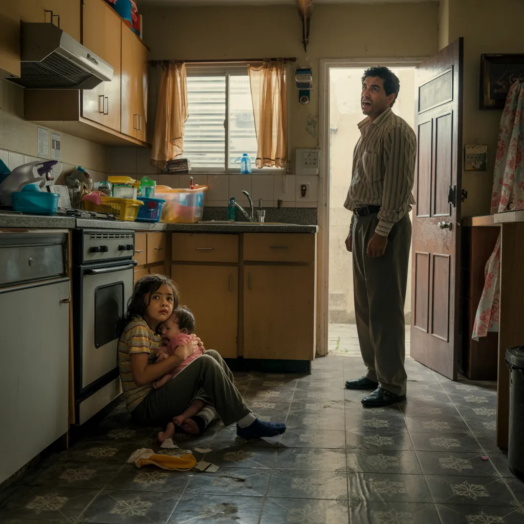 Cuando finalmente llegó a la casa, algo no encajaba. La oscuridad parcial, el ambiente extraño, la ausencia de movimiento normal. Al entrar, el sonido del llanto de un bebé y el choque constante de platos sucios lo guiaron hacia la cocina. Y lo que vio al cruzar la puerta lo dejó inmóvil.