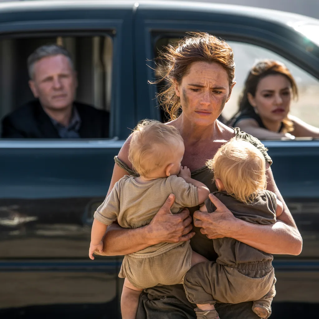 Desde la distancia, la figura de Lucía Salgado parecía frágil, casi desvanecida bajo el peso de su propia vida. No era la mujer luminosa que Emiliano había amado, no era la esposa elegante que recorría salones de mármol y fiestas con él. Aquella mujer tenía la ropa gastada, las sandalias rotas, el cabello castaño recogido apresuradamente y una piel curtida por el sol y el cansancio. Pero lo que más sacudió su mundo fue ver que sostenía en brazos a dos bebés rubios, gemelos, cuyos pequeños cuerpos parecían tan vulnerables como la propia Lucía.
