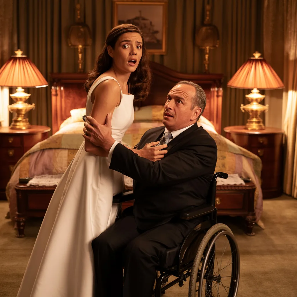 Al finalizar la ceremonia, el silencio se hizo pesado en el dormitorio donde se desarrollaría la noche de bodas. Carolina no podía evitar sentirse atrapada entre la obligación y el miedo a lo desconocido. Eduardo la esperaba junto a la cama, sentado en su silla, con una calma que contrastaba con su propia tensión. Respiró hondo, intentando imponerse a la ansiedad que le recorría el cuerpo. “No necesito ayuda para nada”, pensó, mientras Eduardo la observaba sin decir palabra. Y entonces, en un movimiento que cambiaría todo, él intentó levantarse. Su cuerpo titubeó, y Carolina, por instinto, corrió a sostenerlo. El contacto fue breve, pero suficiente para que notara algo que jamás habría esperado: la fuerza y el control de Eduardo no correspondían a alguien en silla de ruedas. Su corazón dio un vuelco.