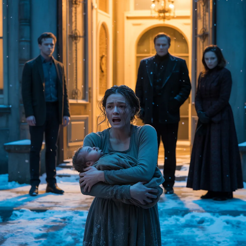 Cuando la puerta se cerró detrás de ella y el frío la envolvió por completo, Naomi sintió que el mundo que conocía desaparecía. Estaba descalza, con su hija en brazos, débil, agotada y completamente sola. La nieve cubría el suelo como una capa silenciosa, y el viento cortaba su piel como pequeñas cuchillas invisibles. Se arrodilló instintivamente, protegiendo a la bebé con su cuerpo, tratando de conservar el poco calor que le quedaba.