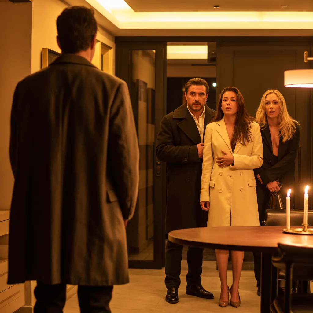 Abrí la puerta y el hombre apareció, alto, con hombros anchos, abrigo oscuro, con una mirada que no necesitaba palabras: sabía exactamente lo que iba a encontrar. La atmósfera cambió de inmediato; se volvió espesa, irrespirable. Valeria giró, sus ojos encontraron al hombre y su rostro se quebró. El color desapareció de su piel, su copa resbaló de sus dedos y estalló contra el suelo. Cayó de rodillas.