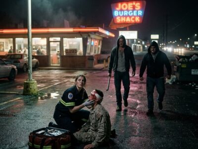 Twelve hours on the ambulance had drained her in ways that didn’t fully register until the world finally went quiet. Her scrubs were stiff with dried sweat and antiseptic stains. Her shoulders ached in that deep, bone-level way only emergency responders truly understood. All she wanted now was food she didn’t have to think about and sleep she didn’t have to fight for.
